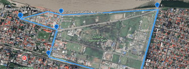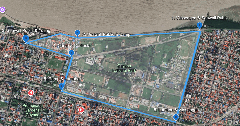 Route: Vlissengen Road & Seawall Public Road -> Seawall Public Road & Camp Road -> Seawall Public Road & Young Street -> Camp Road & Carifesta -> Camp Road & Lamaha Street -> Lamaha Street and Vlissengen Road -> Vlissengen Road & Seawall Public Road (3 times) with the final lap being Vlissengen Road & Seawall Public Road -> Seawall Public Road & Camp Road -> Seawall Public Road & Young Street -> Camp Road & Carifesta -> Camp Road & Thomas Road and one lap of the National Park to finish.