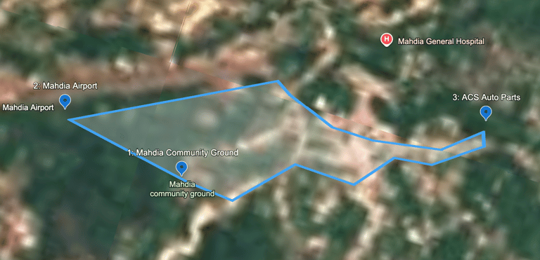 Route: Madhia Community Ground -> Madhia Airport -> ACS Auto Parts -> Madhia Community Ground (x 4 loops).
